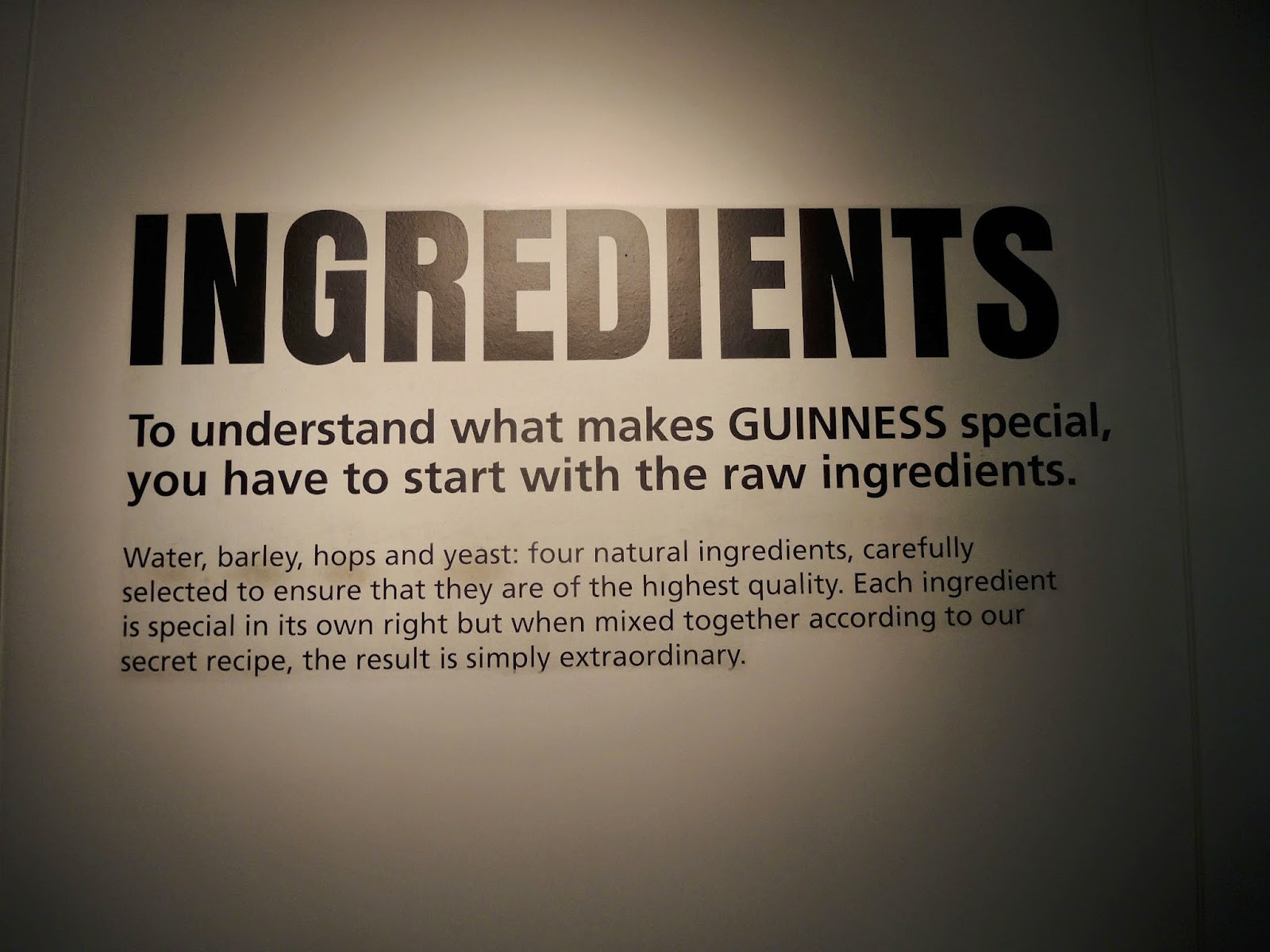 Guinness 黑啤的四大基本成份為水、大麥、啤酒花和酵母。